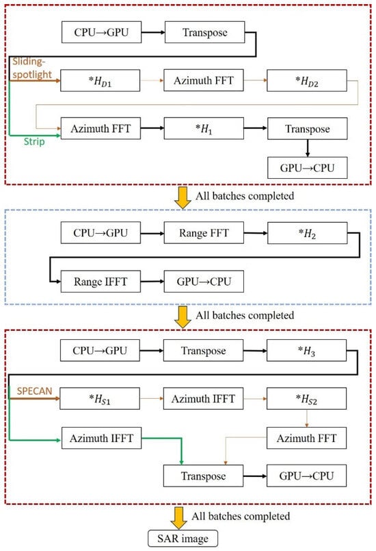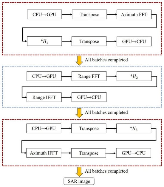 As shown in Figure 1, the CS algorithm for the strip mode can be divided into three parts: the first and third parts handle azimuth processing, while the second part handles range processing. Before processing each part, the data is transferred in batches from the host to the device, and after each batch is processed, the data is transferred back from the device to the host. The complete flowchart of the CS algorithm implementation is shown in Figure 6.