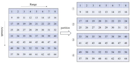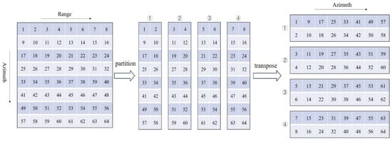 Before the imaging process, the SAR raw data to be processed is read from the file into the host memory . As shown on the left side of Figure 7, is arranged in memory in a row-continuous manner, with the range direction being ordered first.