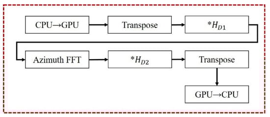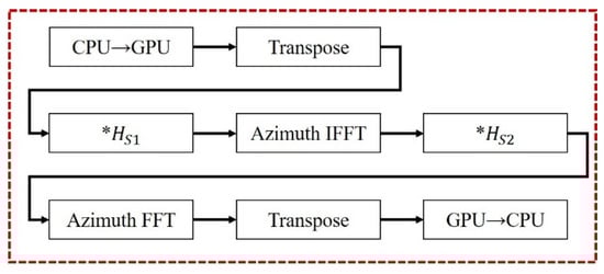 It can be observed that in the CS algorithm, azimuth processing is involved both immediately after preprocessing and just before post-processing. This means that the two newly added processing steps can be merged into the adjacent azimuth processing steps of the CS algorithm, thereby reducing a total of four data transfers between the host and device as well as four matrix transposition operations.