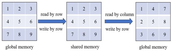 The program contains a total of four matrix transposition operations, so the optimization of the matrix transposition is also important. A typical matrix transposition operation involves reading data from global memory by row and writing by column, or reading by column and writing by row, to achieve the transposition effect. However, in such operations, one memory access will inevitably be non-contiguous, resulting in uncoalesced memory access, which ultimately reduces processing efficiency. To address this issue, shared memory can be used to optimize matrix transposition. As shown in Figure 12, the data is read from global memory by row into shared memory. Then, the data is read from shared memory by column and finally written back into global memory by row, completing the matrix transposition. Although the reading from the shared memory is performed column-wise, the access speed within the local memory is very fast, which significantly improves overall performance. The shared memory is divided into banks, and accessing multiple elements from the same bank simultaneously can cause serialization (bank conflicts), leading to performance loss. To avoid this, the data structure is adjusted to ensure that threads access different memory banks. For example, padding arrays can help prevent conflicts.