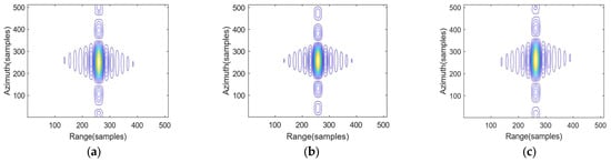 Azimuth preprocessing involves the convolution of the signal in the time domain with a reference signal, which equates to multiplication with the reference function in the frequency domain. Compared to the azimuth spectrum of the original signal, additionally includes the factor . This confirms the correctness of the time–frequency transformation formula and the derivation process. In subsequent imaging, it is necessary to compensate for this phase factor.