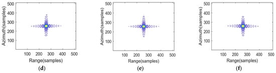 Contour plots of the IRF from the three point targets located along the diagonal using (a–c) the zero-padding method and (d–f) the post-processing method.