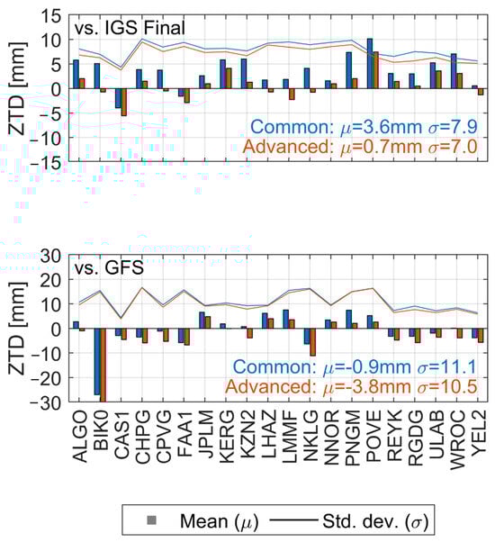 Comparison of RT ZTD obtained with common and advanced strategies against IGS final product (top) and global forecast system model (bottom) [70].