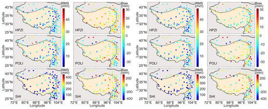 Averaged RMS and bias of proposed HPZI method for 96 GNSS stations at the height plane of 2500 m (left) and 4400 m (right), where the first three rows represent the RMS and bias of the HPZI, POLI, and SHI methods, respectively [78].