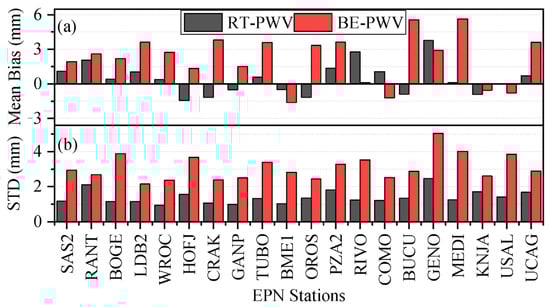 Mean value (a) and STD (b) of the PWV differences for BE-PPP and RT-PPP with regard to radiosondes at 20 EPN stations during a 30-day period [82].