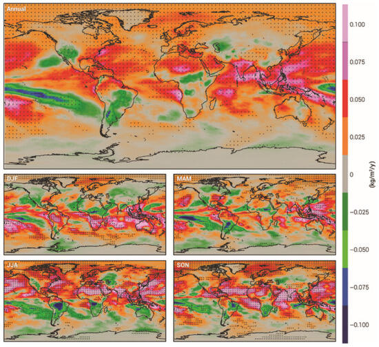 Distribution of annual and seasonal (e.g., winter (DJF), spring (MAM), summer (JJA), and autumn (SON) for the northern hemisphere) water vapor trends derived from ERA5 for the period of 1980–2020. Hatched regions indicate the statistical significance at the 95% certainty interval [4].