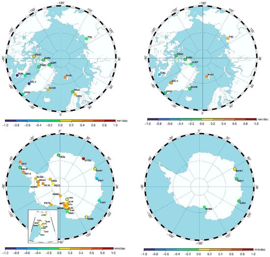 The magnitude of the long-term linear trend value of PWV is presented from two distinct perspectives: GNSS (left) and radiosondes (right). The analysis focuses specifically on the Arctic (upper) and Antarctic (lower) regions. The color of the circles corresponds to the trend value indicated by the color scale, while all the circles with a gray border indicate stations where the trend was found to be insignificant [90].