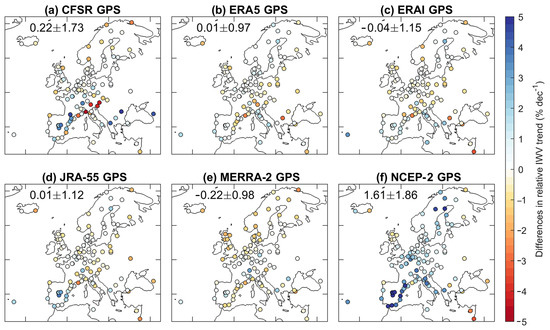 Comparison of the relative IWV trend differences (percent per decade) for various reanalyses with respect to the GPS. The numbers in each subplot indicate the mean value and standard deviation of the associated relative IWV trend differences [55].