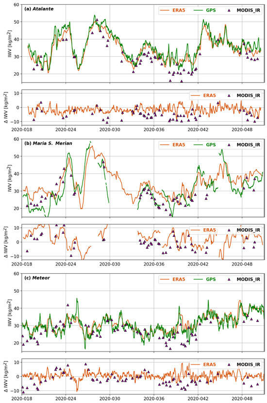 IWV time series from GNSS, ERA5, and MODIS_IR (top panel) and differences with respect to GNSS (ERA5 or MODIS_IR—GNSS) (bottom panel) for the three R/Vs [94].