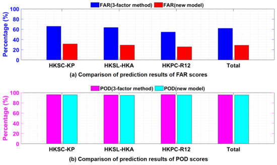 The comparison of prediction results of false alarm rate (a) and probability of detection (b) scores from the new model and the 3-factor method at each station [101].