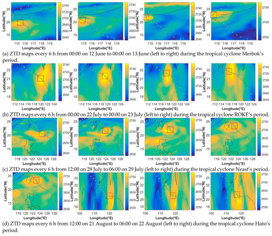 Spatial distributions of ZTD on the route of four tropical cyclones, Merbok (a), ROKE (b), Neast (c) and Hato (d), during the four tropical cyclones’ periods. The red dotted frame indicates the central area of the tropical cyclones [105].