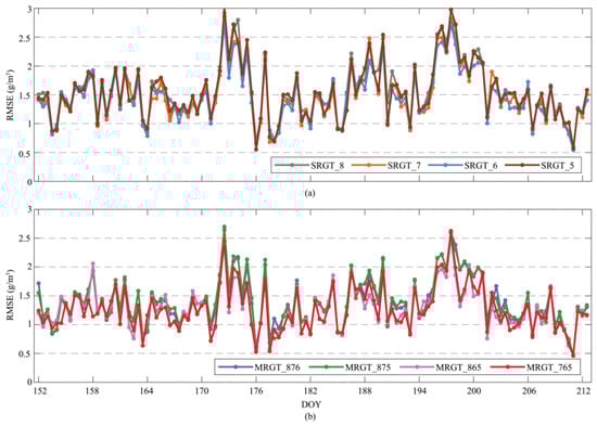 Comparison of the daily RMSE of the tomography results from (a) SRGT and (b) MRGT methods during the tomographic periods [107].