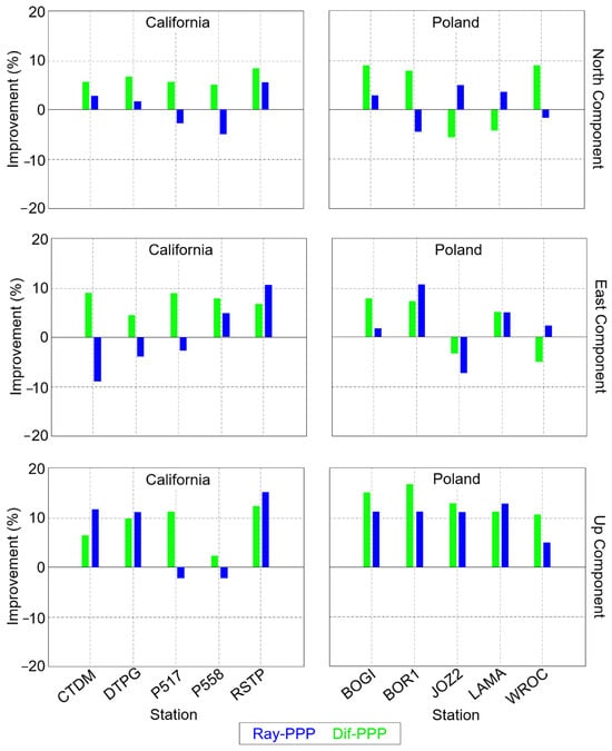 Haji-Aghajany et al. [111] presented an ML-based tropospheric delay prediction method to enhance RT-PPP under extreme weather conditions. Their study employed long short-term memory (LSTM) networks in conjunction with a genetic algorithm (GA) optimizer to predict wet refractivity in GNSS tomography. The prediction was made using datasets from Poland (rain bands) and California (storm events). The predicted wet refractivity was then incorporated into the tropospheric delay estimation via ray-tracing techniques, thereby enhancing the accuracy of PPP. A comparative analysis of three PPP setups was conducted: the first was the Com-PPP (standard method), the second was the Ray-PPP (using ray-tracing delays), and the third was the Dif-PPP (difference between estimated and GNSS-derived delays). The analysis revealed that Dif-PPP exhibits substantial enhancements, with a reduction in mean absolute error (MAE) ranging from 8% to 33% in static mode and a decrease in up-component convergence time by 6% to 17% in kinematic mode (Figure 13). The study’s findings underscore the significance of extreme weather conditions, which introduce substantial horizontal and vertical gradients in tropospheric delays. These gradients can be effectively mitigated by ML-based tomography.