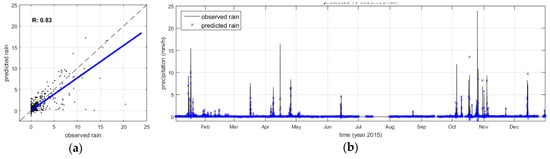 Linear fitting between the predicted rain values from the neural network and the observed rain values, in units of mm/h, for the year 2015 (a). The same comparison is illustrated for all values of the year 2015, organized by time (b). Results correspond to the best score for 100 runs with the initial network parameters [117].