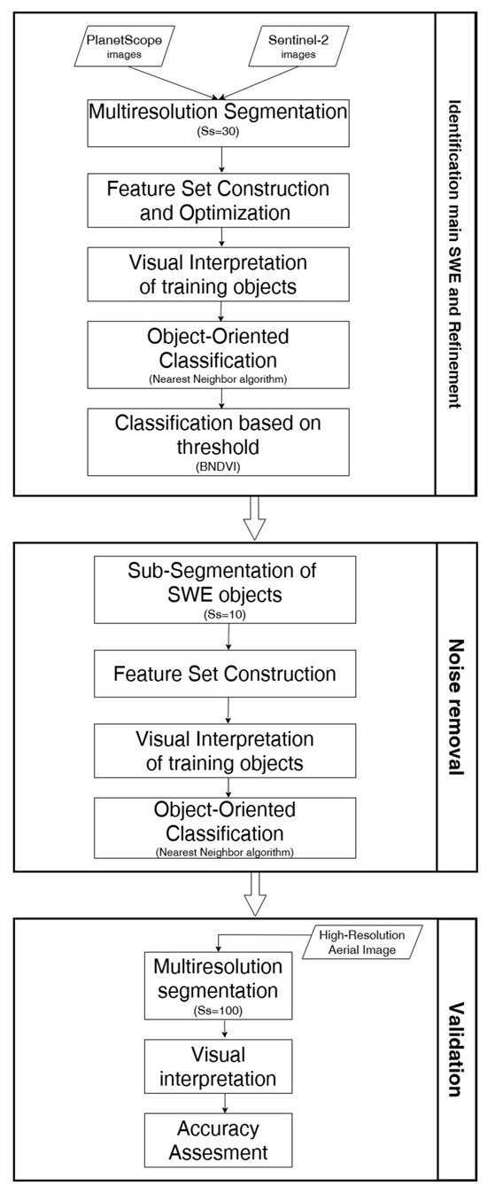 In terms of software implementation, eCognition was chosen because of its robust Object-Based Image Analysis (OBIA) capabilities, which can perform segmentation and classification of SWEs based on spectral and spatial features. eCognition has a flexible rule-based classification and machine learning environment that is suitable for working with high-resolution imagery.