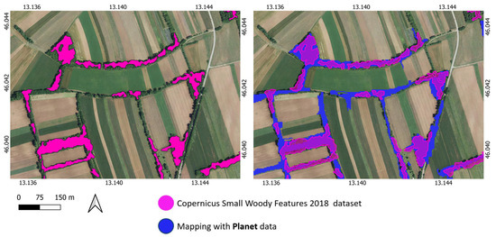 - Faucqueur, L.; Morin, N.; Masse, A.; Remy, P.-Y.; Hugé, J.; Kenner, C.; Dazin, F.; Desclée, B.; Sannier, C. A New Copernicus High Resolution Layer at Pan-European Scale: Small Woody Features. In Proceedings of the Remote Sensing for Agriculture, Ecosystems, and Hydrology XXI, Strasbourg, France, 21 October 2019; SPIE: Bellingham, WA, USA; Volume 11149, pp. 268–278. [Google Scholar]