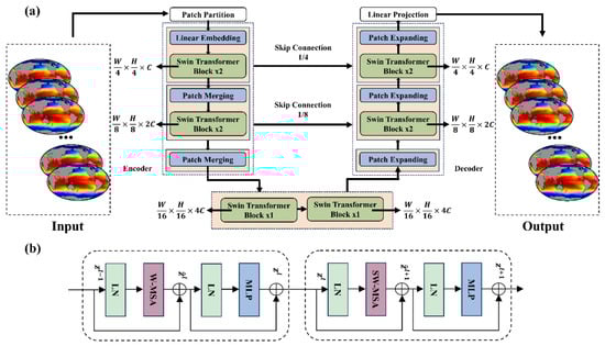 The proposed U-Transformer architecture eliminates convolutional and recursive operations, replacing them with a self-attention mechanism to extract multivariate relationships in parallel, regardless of spatial and temporal distance. The U-Transformer, as shown in Figure 1a, comprises an encoder, decoder, and skip connections [44] and was built on the Swin Transformer module [45]. The Swin Transformer module employs self-attention within nonoverlapping local windows to reduce network complexity and build hierarchies for multiscale feature extraction.