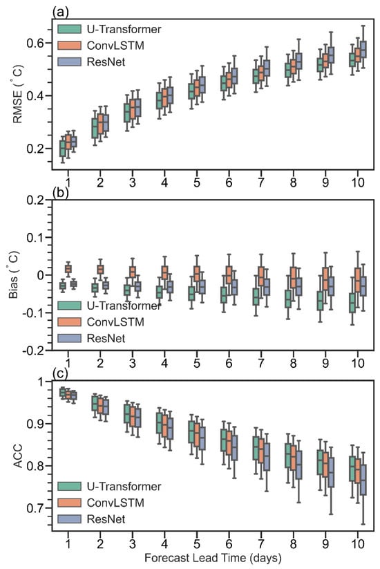 Boxplots comparing the performance of three DL models (U-Transformer, ConvLSTM, and ResNet) in terms of (a) RMSE, (b) Bias, and (c) ACC across lead times of 1 to 10 days during 2020–2022. Each boxplot represents the distribution of globally weighted averaged metrics across different forecast initialization times.