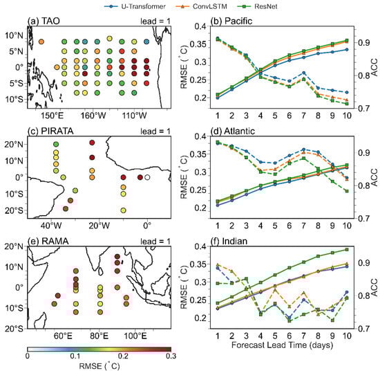 Statistical analysis was also performed for the tropics and the regions with active mesoscale eddies. In the tropical and subtropical oceans, the RMSEs are relatively low and generally remain below 0.2 °C, except in the eastern equatorial Pacific (Figure 3a), which is characterized by the Tropical Instability Wave (TIW). In this area, RMSEs exceed 0.3 °C, consistent with findings from previous studies [23,54], highlighting the challenges in forecasting daily SST changes in the TIW region. In the Atlantic and Indian oceans, higher RMSEs (calculated using observed data from moored stations) are observed in the northeast, while smaller RMSEs (<0.2 °C) are found in the western Atlantic (Figure 3c). The Indian Ocean exhibits a relatively uniform distribution of RMSEs, with values generally above 0.25 °C (Figure 3e). RMSEs are distributed unevenly in the Pacific Ocean, with higher values in the eastern equatorial region and lower values in the western parts (Figure 3a). Overall, the ACC decreases as the forecast lead time increases, with the U-Transformer model demonstrating the largest correlation forecast in the Pacific and Atlantic regions (Figure 3b,d). On the first forecast day, the ACC is approximately 0.9, with the Atlantic region showing the best correlation performance. Interestingly, the ACC does not exhibit a strictly monotonic decrease as the forecast lead time extends, possibly due to the limited number of observed samples available for evaluation.