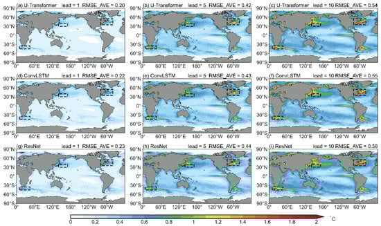 Figure 2 illustrates the forecast performance comparison of the three DL models across different lead times. The global average RMSEs produced by the U-Transformer model ranges from 0.2 °C on day 1 to 0.54 °C on day 10 during 2020–2022 (Figure 2a), demonstrating consistent forecast accuracy. At the 5-day lead time, the U-Transformer model achieves a global RMSE of 0.42 °C, slightly outperforming the ConvLSTM and ResNet models with RMSEs of 0.43 and 0.44 °C, respectively. Although the RMSEs increase with increasing lead time for all three models, the U-Transformer model consistently maintains the smallest RMSE values for all (from 1- to 10-day) lead times. Additionally, the U-Transformer and ConvLSTM models show smaller spreads in their RMSE distributions compared to the ResNet model from 4- to 10-day lead times, indicating more consistent forecast performance across different initialization times. Previous studies report that dynamic forecast models produce RMSEs for SST forecasts ranging from 0.35–1.1 °C at the 1-day lead time [50,51,52,53]. Compared with the RMSEs of SST forecasted by dynamic models, the U-Transformer model can reduce the global SST forecast errors, achieving a 1-day RMSE of 0.2 °C in the current study. Furthermore, when compared to another deep learning model [27] that reports a 1-day RMSE of 0.27 °C, the U-Transformer model built in this study shows a lower RMSE. These comparisons show that the U-Transformer model outperforms other models in short-term global SST forecasts.