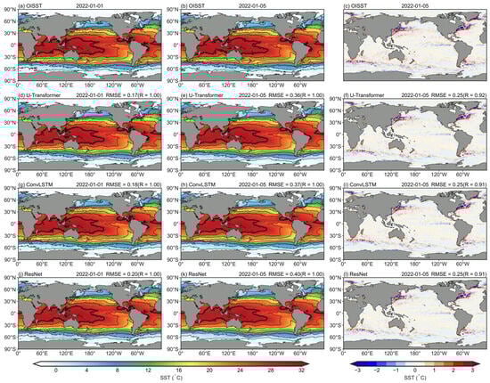 Global SST from observation and forecasts from three DL models, at a 1-day lead (1 January 2022) and a 5-day lead (5 January 2022) starting from 1 January 2022. (a–c) OISST; (d–f) U-Transformer; (g–i) ConvLSTM; (j–l) ResNet. RMSEs and pattern correlation coefficients (R) of forecast SST from models and observations in the upper right corner. The first and second columns display the raw SST values, with thin black contour intervals representing 4 °C isotherms and thick black lines denoting 28 °C isotherms. The third column shows the filtered mesoscale signal obtained by subtracting the low-pass filtered SST (3° × 3°) from the raw SST values.