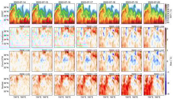 Comparison of OISST and SST forecasts by three deep learning models in the Kuroshio Extension region from 14 July 2022 to 20 July 2022. The first row represents OISST, while the second, third, and fourth rows show forecast biases from the U-Transformer, ConvLSTM, and ResNet models.