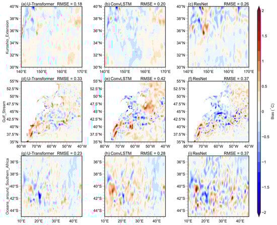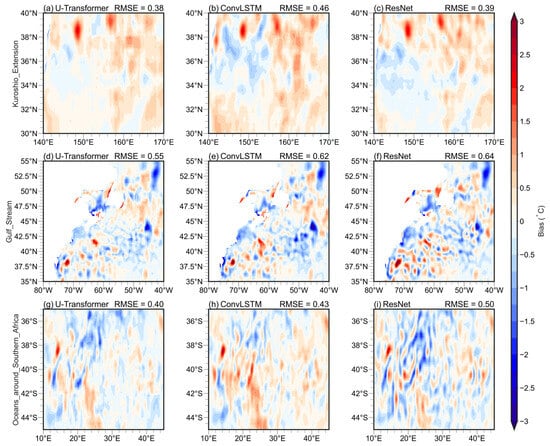 Compared with the smaller RMSE cases (Figure 7), the larger RMSE cases (Figure 8) exhibit larger biases for the same region. Even under these cases, the U-Transformer model demonstrates smaller SST biases than the ConvLSTM and ResNet models, but the differences vary by region and model. In the KE region, the U-Transformer achieves RMSE reductions of 17% and 3% compared to ConvLSTM and ResNet, respectively. In the GS region, the RMSEs for the U-Transformer are 11–14% smaller than those of the other two models. In the OSA, the U-Transformer reduces RMSEs by 7% compared to ConvLSTM and by 20% compared to ResNet. While the U-Transformer consistently outperforms the other models, the relative improvements are smaller in the larger RMSE case. The above results may be related to much more apparent eddy structures in Figure 8 than in Figure 7. These intensified mesoscale eddies significantly influence SST forecasts, highlighting the challenges of accurately capturing such complex dynamics.
