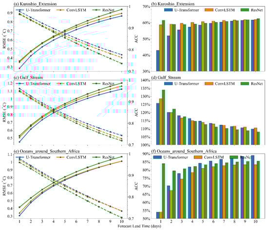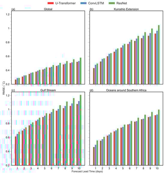 Although the U-Transformer shows improved performance compared to ConvLSTM and ResNet, its RMSEs remain 40–130% higher than the global average in regions with active mesoscale eddies, highlighting the forecasting challenges in these dynamically complex areas. For example, in the Gulf Stream region, RMSEs exceed twice the global average, reaching up to 1.2 °C, and forecast skill declines more rapidly. These difficulties are mainly due to the intrinsic dynamical features of these regions, including energetic eddy activity, strong nonlinear processes, and complex air–sea interactions, which make short-term SST evolution inherently harder to predict. Future research should focus on improving model performance in these challenging regions.