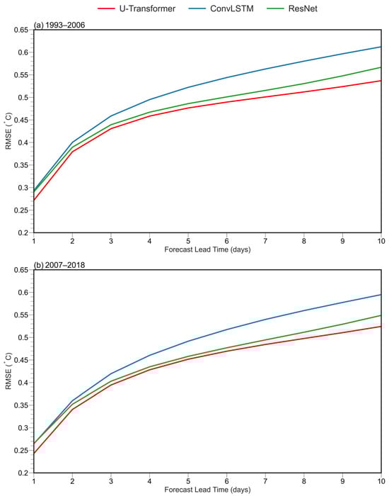 RMSE comparison of three models (U-Transformer, ConvLSTM, and ResNet) on validation samples from different periods. (a) Performance on validation samples from 1993–2006, showing RMSE values as a function of forecast lead time. (b) Performance on validation samples from 2007–2018.