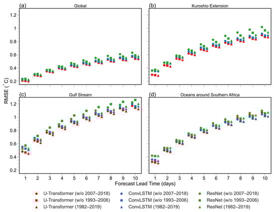 Figure 11 presents the RMSE values from the three experiments across global and regions with active mesoscale eddies. Firstly, models trained on the full dataset spanning 1982–2019 achieved the smallest RMSEs in both global and regional evaluations (Figure 11). Additionally, excluding the 2007–2018 period leads to significantly higher RMSEs than excluding the 1993–2006 period in almost all models and regions, strongly indicating that the data from 2007–2018 plays a more critical role in model performance. Possible reasons include the stronger mesoscale SST variabilities during 2007–2018 compared to 1993–2006 [61] and the higher similarity of mesoscale SST variabilities during 2007–2018 to those in the forecast years (2020–2022). These results suggest that incorporating both weak mesoscale SST variabilities (from 1993–2006) and strong mesoscale SST variabilities (from 2007–2018) in the training data can substantially enhance the model’s generalization ability.