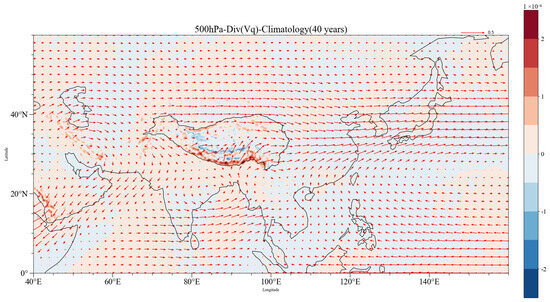 Spatial and temporal variations in moisture over the TP in summer drive the local water cycle processes [11]. Moreover, adequate moisture supply is essential for precipitation generation and influences atmospheric moisture content. Moisture content and transport play crucial roles in precipitation formation. The water vapor budget over the TP is affected by the South Asian monsoon, East Asian monsoon, mid-latitude westerly winds, and other circulation systems. Therefore, examining the characteristics and influencing factors of TP moisture transport is of great significance for understanding changes in the hydrometeorological cycle and the ecological environment of surrounding regions. There are two main sources of moisture transport in the TP during the summer, the Indian summer monsoon [1,12] and the mid-latitude westerlies [13], which are clearly evident in the climatological distributions of vertically integrated water vapor fluxes and divergence over the TP (Figure 1). The strongest moisture transport originates from the Arabian Sea and Bay of Bengal through the South Asian monsoon system. In a study on the interannual oscillatory variability of moisture over the TP, Liu [11] found that in terms of temporal variability, the summer moisture balance exhibits 7–12-year cycle. Similarly, Meng [14] demonstrated that the summer moisture balance over the TP in the past two centuries has primarily been characterized by quasi-4–6-year interdecadal variability.
