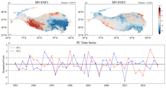 The results of the Combined-EOF analysis show that the variance contributions of the first four modes are 54.91%, 12.24%, 10.50%, and 5.64%, respectively. Since the cumulative variance contribution of the first two modes is 67.15%, which contributes the majority of the variance, we focus on the first two modes. The Combined-EOF of the longitudinal and latitudinal components of the water vapor integral generates only produce one set of time series and explained variance. The first mode accounts for 54.91% of the explained variance (Figure 2a). In the positive phase of the first mode, the water vapor flux flows from the south, north, and west to the east, and the value in the south is obviously greater than that in the north and west. The divergence of the water vapor flux shows an east–west dipole pattern, with a large value area of the divergence integral of water vapor flux located along the southern margin of the TP.