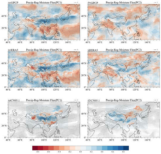 Distribution of regression coefficients for (a) PC1 and (b) PC2 with precipitation field (color-filled; unit: mm/day), with white dotted area dots representing regression coefficients for shaded area passed 0.05 significance level, and arrows representing primary modes of moisture fluxes from 1983 to 2022 and (c) PC1 and (d) PC2 with precipitation field (color-filled; unit: mm/day) by monthly precipitation field data from ERA5 reanalysis and (e) PC1 and (f) PC2 with precipitation field (color-filled; unit: mm/day) by monthly precipitation field data from CN05.1 (daily meteorological datasets with horizontal resolution of 0.25° × 0.25° interpolated from observations at several stations in China and processed to monthly averages).