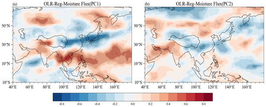 Distribution of regression coefficients for (a) PC1 and (b) PC2 with OLR field (filled colors; unit: ), with black dotted area indicating that regression coefficients for this shaded area pass 0.01 level of significance, gray color indicating 0.05 level of significance, and light gray color indicating 0.1 level of significance.