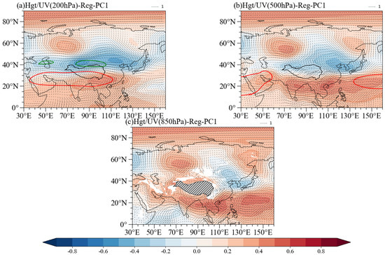 (a) The 200 hPa, (b) 500 hPa, and (c) 850 hPa circulation anomaly patterns as regressed to PC1 (wind unit: , height unit: ), with the dotted areas passing the significance test at the 95% confidence level, where (a) the green and red contours denote the climatic westerly jet stream and the South Asian High and (b) the red line represents the climatic state of the Western Pacific Sub-High.