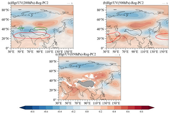 In the second mode, at the 200 hPa (Figure 6a), a high-pressure center is located to the north side of the TP, corresponding to an anticyclonic flow field. On the other hand, there is a low-pressure center on the eastern and western sides of the plateau, corresponding to a cyclonic flow field. At 500 hPa (Figure 6b), the high-pressure center on the northern side of the plateau corresponds to anticyclonic circulation, with a high-pressure center over the Arabian Sea. At the 850 hPa (Figure 6c), the high-pressure system on the northern side of the plateau shifts eastward and weakens, while the high-pressure system over the Arabian Sea strengthens.