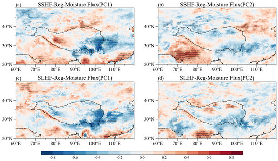 The latent heat of the TP during summer affects the temperature of the middle and upper troposphere over Central Asia by modulating the plateau monsoon and the Indian Ocean SST. This, in turn, affects the circulation at the 200 hPa and 500 hPa levels, as well as the moisture transport of the whole layer, thus altering precipitation patterns in surrounding regions [52,53]. The analysis considers the surface upward flux to be positive. In the first mode (Figure 7c), the latent heat flux is relatively less anomalous in the southeastern, southwestern, and surrounding areas of the TP, where moisture is released, providing a continuous moisture supply for precipitation. This result is consistent with the precipitation distribution and moisture flux divergence patterns. More moisture is absorbed in the northwestern TP, and the latent heat flux shows a positive correlation with the convective activity in the western TP, which is closely related to the underlying surface characteristics of the western TP [54]. In the second mode (Figure 7d), the latent heat flux is lower in the southwest and southeast of the TP, providing moisture for precipitation in eastern China.