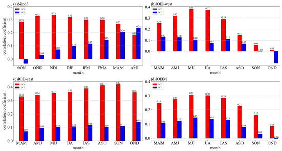 Lead–Lag correlation analysis among (a) Niño3 index, (b) IOD West Pole index, (c) IOD East Pole index, and (d) IOBM index and PC index, where SST variability factor is sliding mean of 3-month set (abbreviation stands for first letter of each of three consecutive months, e.g., March to May is MAM).