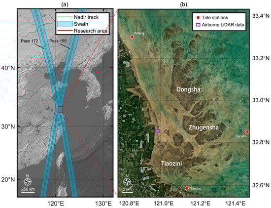Since July 2023, NASA and CNES have begun releasing SWOT L2 products for the science orbit, including the LR products and the HR (High resolution) products for ocean and inland water applications, respectively (https://www.earthdata.nasa.gov/). This study employs 50 tracks of SWOT data from July 2023 to December 2024 (with 25 tracks each from PASS 159 and PASS 172) for intertidal DEM extraction. The distribution of the tracks and swath coverage is illustrated in Figure 1a by green solid lines and blue polygons, respectively. Considering the data gaps of the HR data within the study area, the SWOT L2 LR unsmooth product with a spatial resolution of 250 m is employed for DEM extraction and performance evaluation. Additionally, the SWOT L3 LR product, which is derived from the L2 LR product after further error corrections by CNES, is utilized in this study. Both the L2 and L3 products use the WGS-84 reference ellipsoid. (https://www.aviso.altimetry.fr/en/missions/current-missions/swot/public-release-of-the-swot-level-3-l3-product.html, accessed on 21 April 2025). Building on the corrections provided by the L2 LR product, the L3 LR product incorporates multi-altimetry mission corrections (including crossover adjustments, cross-track phase error, and tilt correction), noise reduction using convolutional neural network technology, and outlier removal []. These enhancements significantly improve the signal-to-noise ratio and reduce systematic errors in SWOT data. However, due to potential misidentification issues in intertidal zones caused by outlier removal, this study only uses the calibration information from the L3 product.