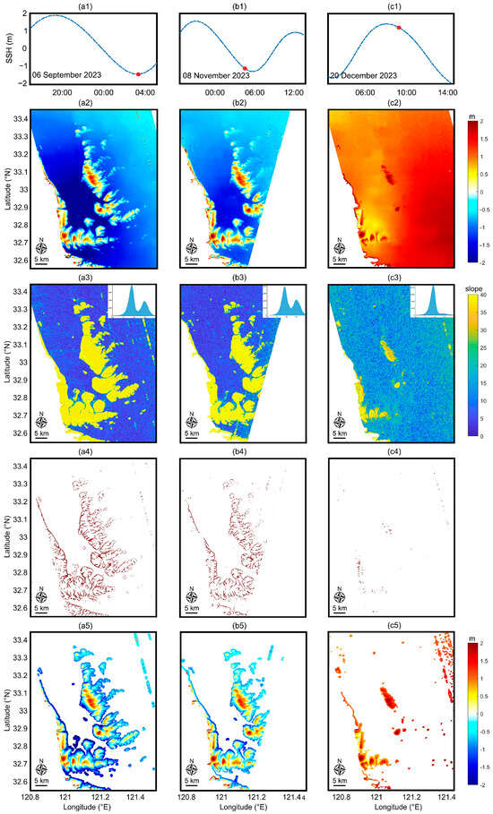 Data processing flow for representative SWOT data. The first row (a1,b1,c1) provides the tidal heights during the SWOT overpass over the study area; the second row (a2,b2,c2) displays the original SWOT SSH data; the third row (a3,b3,c3) shows the maximum slope map and its distribution histogram; the fourth row (a4,b4,c4) presents tide channel and land–water boundary masks; and the fifth row (a5,b5,c5) exhibits the DEM signal extraction results. Each column corresponds to data from different time points: the first column (a1–a5) from 6 September 2023; the second (b1–b5) from 8 November 2023; and the third (c1–c5) from 20 December 2023.