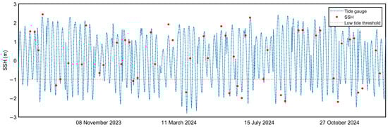The tide data from the Dafeng Station (blue dashed line), SWOT-derived SSH (red scatters), and the low-tide threshold (red dashed line).