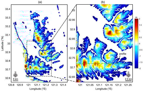 This study employs tidal variation analysis to identify SWOT observations corresponding to low-tide periods, thereby maximizing the extraction of tidal flat morphology and ensuring the spatial continuity of the resulting DEM. The tide gauge data from July 2023 to December 2024 at Dafeng Station, shown in Figure 6, reveal significant tidal variations within the study area, with a maximum tidal range exceeding 5 m. Specifically, the highest tide reached 2.4 m on 5 August 2024, while the lowest tide fell to −2.8 m on 12 March 2024. Therefore, the SWOT data from the lowest tide level (7 October 2024, with an SSH of −1.99 m) is selected for DEM analysis. Figure 7a illustrates the DEM results based on LR data, along with the local magnified view in Figure 7b. It shows that the intertidal DEM in this region ranges about ±2 m. Specifically, the maximum elevations in the Tiaozini, Gensha, and Dongsha areas are 2.3 m (32.74°N, 121.03°E), 2.1 m (32.88°N, 121.15°E), and 1.89 m (33.5°N, 121.11°E), respectively. The magnified views reveal more detailed DEM features, particularly in the Tiaozini area. The elevation distribution shows a gradual decrease from 32.717°N towards both sides, highlighting isolated hilltops and gullies formed by tidal effects. These characteristics indicate that the intertidal terrain has been shaped through erosion and deposition processes. The periodic rise and fall of tides endow the topography of this region with significant spatiotemporal variability.