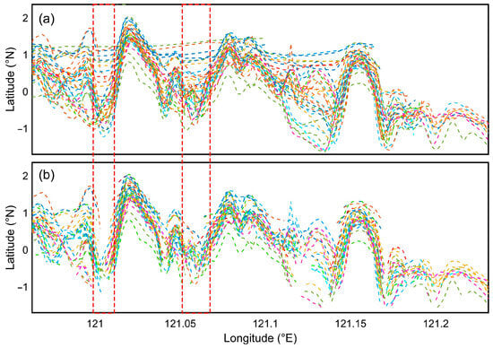 The DEM profiles along 32.72°N derived from LR data (a) without and (b) with the tidal channel mask applied. The colors represent DEM profiles derived from different dates.