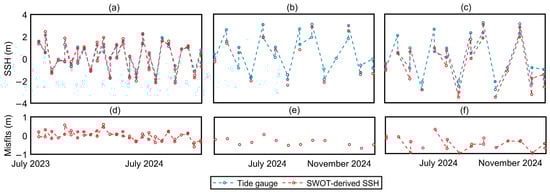 SSH results from tide gauge data (blue dashed line) and SWOT data (red dashed line) on (a) Dafeng Station, (b) Gensha Station, and (c) Yanghe Station; (d–f) are corresponding misfits between SWOT-derived SSH against tide gauge data, respectively.