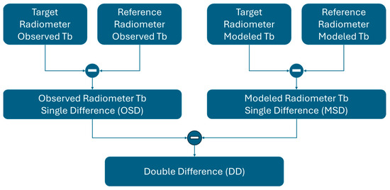 Unfortunately, for radiometers of different design, the situation is more complicated because the scene brightness varies with both the observing frequency and viewing geometry. To accommodate these differences, the DD approach is used to estimate the calibration bias, as shown in Figure 2. The basis of this method is the normalization of the two Tb (observations) by taking the single difference of the corresponding observed brightness values given as the observed radiometer single difference (OSD),