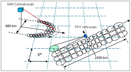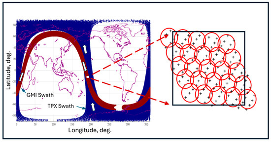Typical GMI (red) and TPX (blue) measurement swath collocations (left). Insert on right shows a single collocation grid “box” comprising five TPX scans by five TPX beam positions. Red circles are TPX IFOVs, and “+” symbols designate centers of GMI measurements.