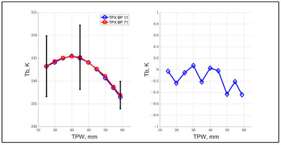 Comparison of TPX-modeled TOA brightness temperature for beam positions 11 and 71, as a function of retrieved TPW from GMI simultaneous multi-channel observations. The right panel is the difference in modeled brightness temperatures, and the associated error bars are ±1 sigma values about the mean.