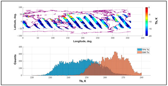 A typical example of the daily collocation swaths over oceans for TPX ascending orbit segments, is shown in Figure 8, where the spatial coverage is defined by the overlap of the closest orbits in time (typically <1 h), and the color scale is the box average observed Tbs for TPX (upper panel) and for GMI (lower panel). Next, the XCAL bias was calculated using OSD = Tb_tpx − Tb_gmi, and the results are displayed as the color scale in the upper portion of Figure 9. Also shown, in the lower panel of Figure 9, are the respective histograms of TPX and GMI Tbs, which differ significantly in their mean values.