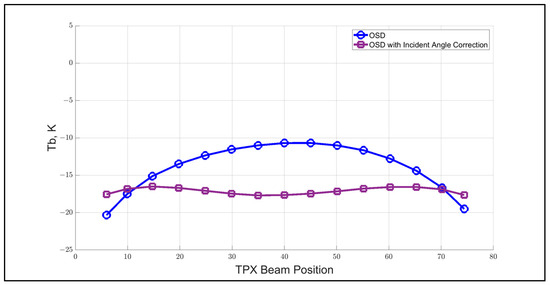 The OSD results, plotted in Figure 10, show an approximately symmetrical distribution with TPX EIA about the nadir (beam position 41), which violates the assumption of independent random errors. Therefore, a reasonable solution was to characterize the systematic change in the measured Tb with EIA and to apply this correction before calculating the OSD. Because TPX matched the GMI EIA at beam positions 11 and 71, the zero-correction reference was their average value, and the resulting XCAL biases (versus EIA) are plotted in Figure 10 (red curve). So, after applying this TPX EIA normalization, the bias is “flat” (apparently independent of beam position).