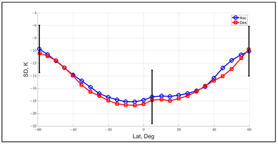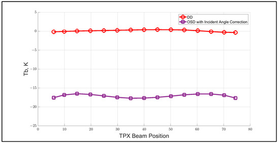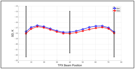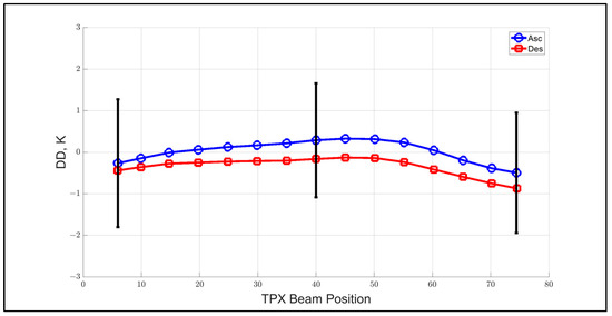 Next, we proceed with other analyses to assure that this EIA normalized OSD is free from other systematic effects. For this purpose, we divide the match-up dataset into TPX ascending (daylight) and descending (nighttime) orbit segments and compare corresponding OSDs. Consider first Figure 11, which is similar to Figure 10, with the exception that ascending and descending orbit segments are separated. Here, the beam-corrected OSD dependence on TPX beam position varied by only about ±1 K; and the separation between ascending and descending orbit segments exhibited a 0.3 K bias, which is significant but also not a major concern.